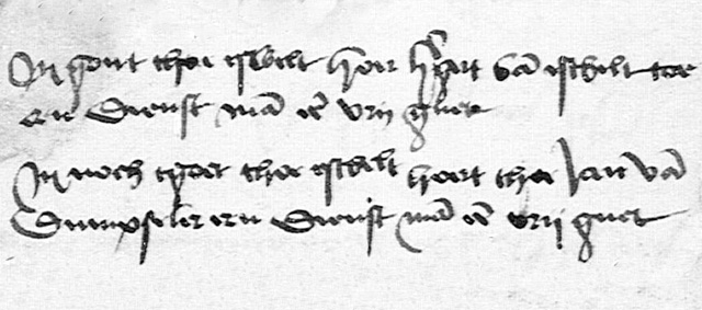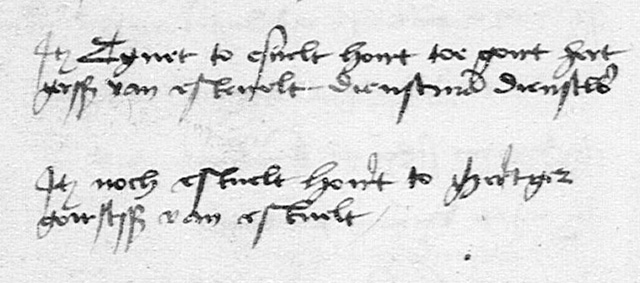 Er is dan een verandering zichtbaar; In de eerste regel staat nu dat het eerste goed Estvelt toebehoort aan H(ar)tger van Estvelt die een dienstman op een vrij goed is. En in de tweede regel staat dat het andere goed Estvelt toebehoort aan Jan van Domseler die ook een dienstman op een vrij goed is. Dat het pachtcontact in 1490 van een goed op Estvelt voor de helft ineens op naam van een van Domseler staat is opmerkelijk, maar verklaarbaar. Want;