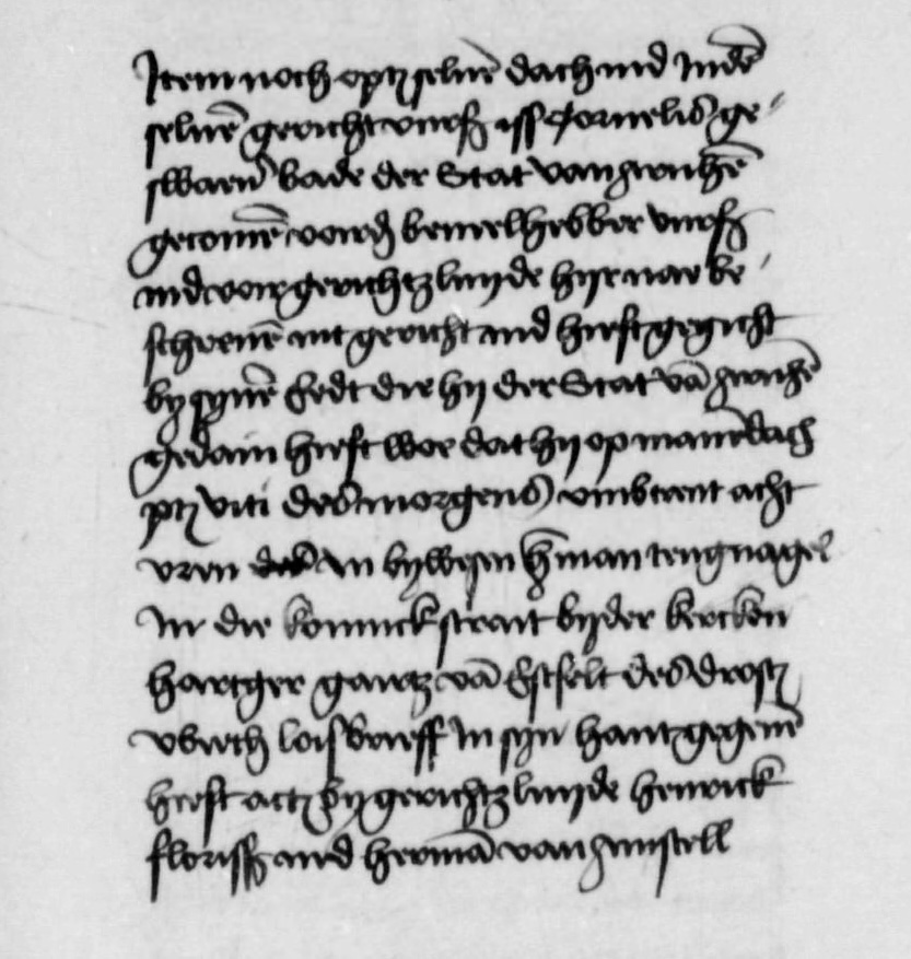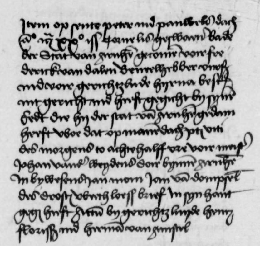 Op sente Peter und Pouwels dach Anno 1520 iss Cornelis geswaen bode der stat van Arnhem gecome voir Frederick van Dalen bevelhebber vurschr und voir gerichtslude hijrna beschr int gericht und heeft gegicht bij sijne eedt die hij der stat van Arnhem gedaen heeft woe dat op manedach ptl Viti des morgens to achtehalff ure voir meist Johan vande Weijdens dair bijnne Arnhem in bijwesens Jan Mom, Jan van Dompseler des drost weeth loess brief in sijn hant gegh heeft Actum bij gerichtsluijde Henrij Florisz und Herman van Amstel
