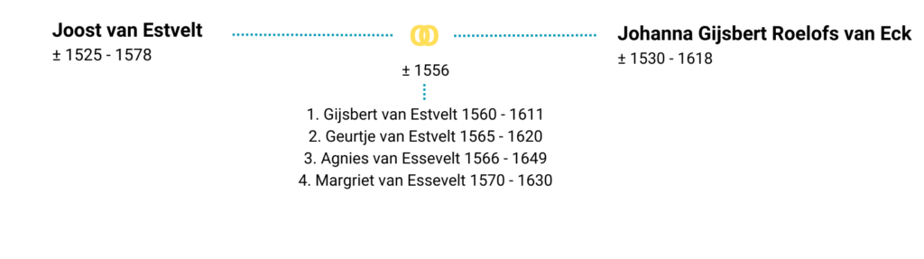 Joest is de zoon van Gourt van Estvelt. Vanaf 1554 krijgt hij de pacht van een halve hofstede met land in Eck, groot 12 morgen, met dijk en wetering, genaamd de Meyerskamp, belast met de helft van 7 malder mout en 20 penning. Daarnaast pacht hij jaarlijks een stuk land in de uiterwaarden bij Wiel. Naast boer is hij ook buurmeester van Eck en kerkmeester van de st. Annakerk. Deze functies worden alleen vervuld door personen van ‘goede’ komaf. Als buurmeester let hij erop dat de boeren hun sloten en beken goed open hielden, zodat er een goede waterhuishouding was.