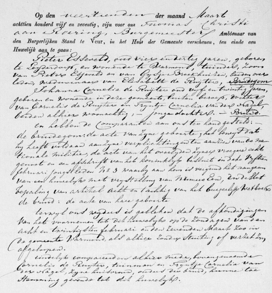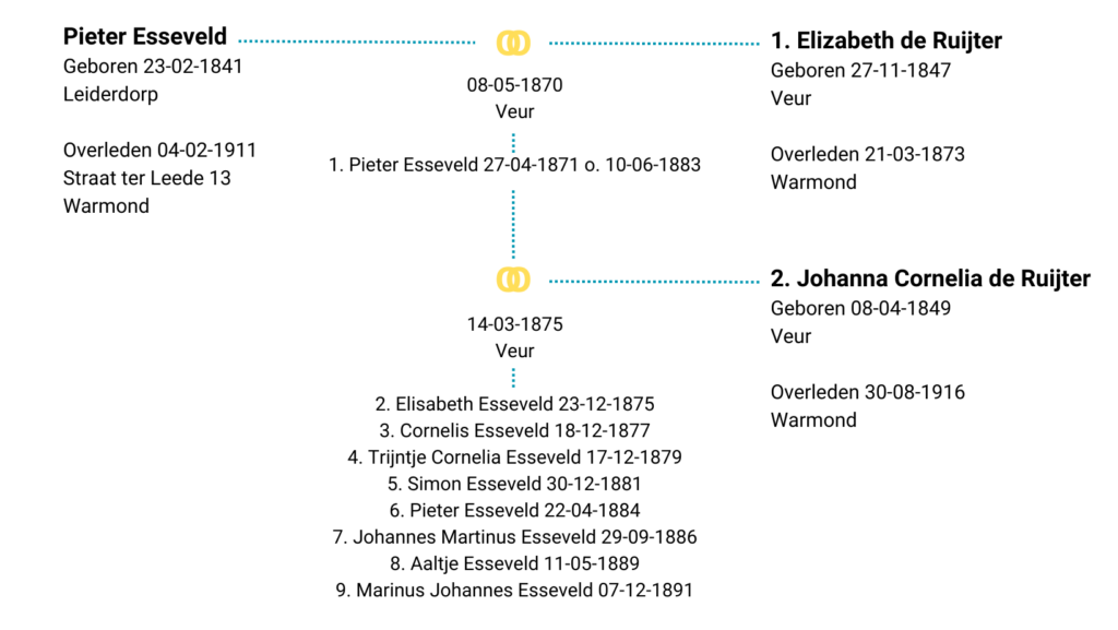 Op zijn 29e trouwt hij met Elizabeth de Ruijter, dochter van tuinbaas en warmoezenier uit Veur. Vijf jaar later trouwt hij met haar twee jaar jongere zusje Johanna Cornelia. Samen krijgen zij acht kinderen. Ze wonen dan op de Dorpsstraat 78.