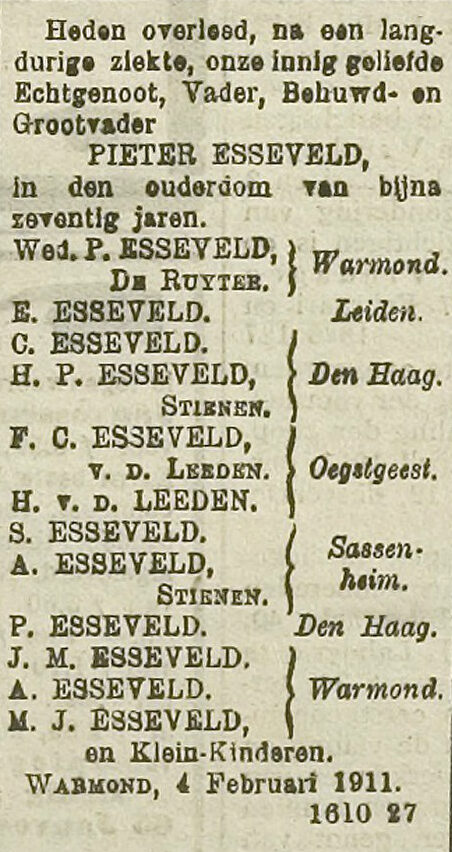 Pieter overlijdt op 4 februari 1911 op 69 jarige leeftijd. Uit zijn overlijdensadvertentie in de krant blijkt dat zijn kinderen volwassen, deels gehuwd en reeds uitgevlogen zijn naar andere steden. Ook zijn er al kleinkinderen geboren. Zijn weduwe Johanna Cornelia overlijdt vijf jaar later.