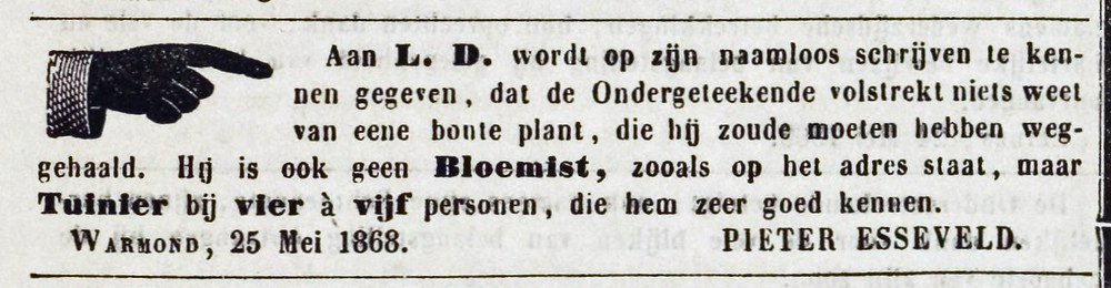Als tuinier werkt hij onder andere bij de heren D.S. en J. Bredenberg, oprichters van de plaatselijke kalkoven industrie en mogelijk ook bij ‘Huys te Warmondt’, bewoond door de graaf van Limburg Stirum.