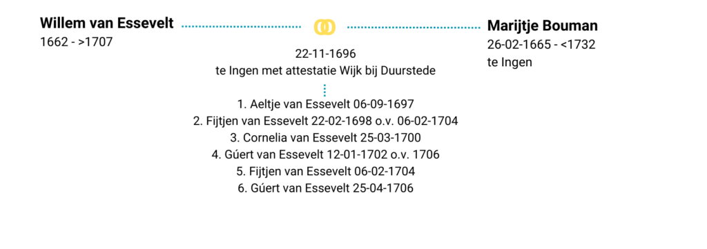 De oudere broer van Willem; Gijsbert wordt brouwer en herbergier in Amerongen en doet ook zaken in Rotterdam. Neef Joost, duikt op in Delft. Neef Merten vertrekt naar de Prinsengracht in Amsterdam. Neef Alart trouwt in ‘s-Gravenhage en nicht Maria trouwt in Rotterdam. Ook hieruit blijkt weer dat de Ingense Essevelts zich in deze jaren meer naar het westen verspreiden.